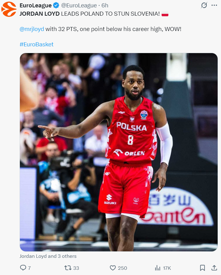 在2025年8月8日,波兰篮协官宣归化了美国后卫乔丹-洛伊德,这位身高1.93米的后卫曾在2019年跟随猛龙夺冠,职业生涯过NBL、以色列联赛、西甲、NBA、G联赛、俄罗斯联赛等。