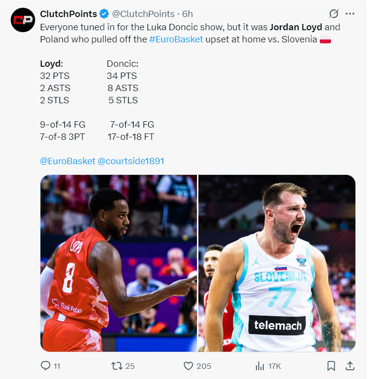 北京时间8月29日凌晨,2025年男篮欧洲杯小组赛,波兰男篮105-95击败斯洛文尼亚男篮拿到开门红。D组的以色列、波兰、法国都拿到首胜,斯洛文尼亚、冰岛、比利时都遭遇开门黑。斯洛文尼亚在有卢卡-东契奇这位NBA天皇巨星的情况下还是不敌波兰让不少欧媒议论纷纷。