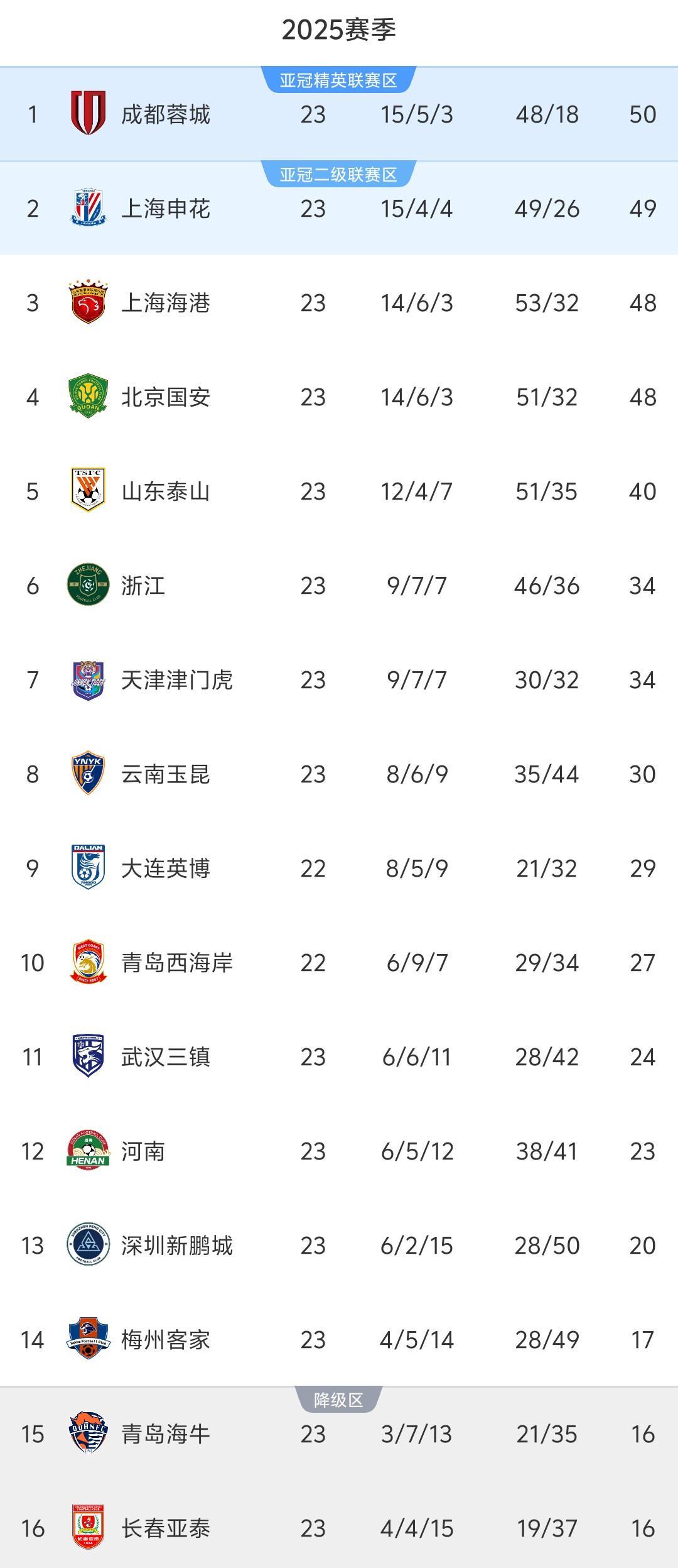 23轮过后的积分榜,由于4支争冠球队本轮仅有1队取胜,因此争冠形势再次发生变化。客场惨遭绝杀的申花捍卫榜首失利,积49分的他们被50分的成都蓉城反超,从而让出榜首退居第2。惨败的国安与上港仍同积48分,但本轮狂丢6球,因净胜球劣势跌到第4,上港则升至第3。